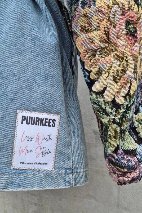 Deze unieke jas is helemaal one of a kind. Gemaakt van een vintage spijkerjas met tapestry-mouwen en bijpassende zakjes. Stoer denim en een vleugje retro bloemen: de perfecte mix.