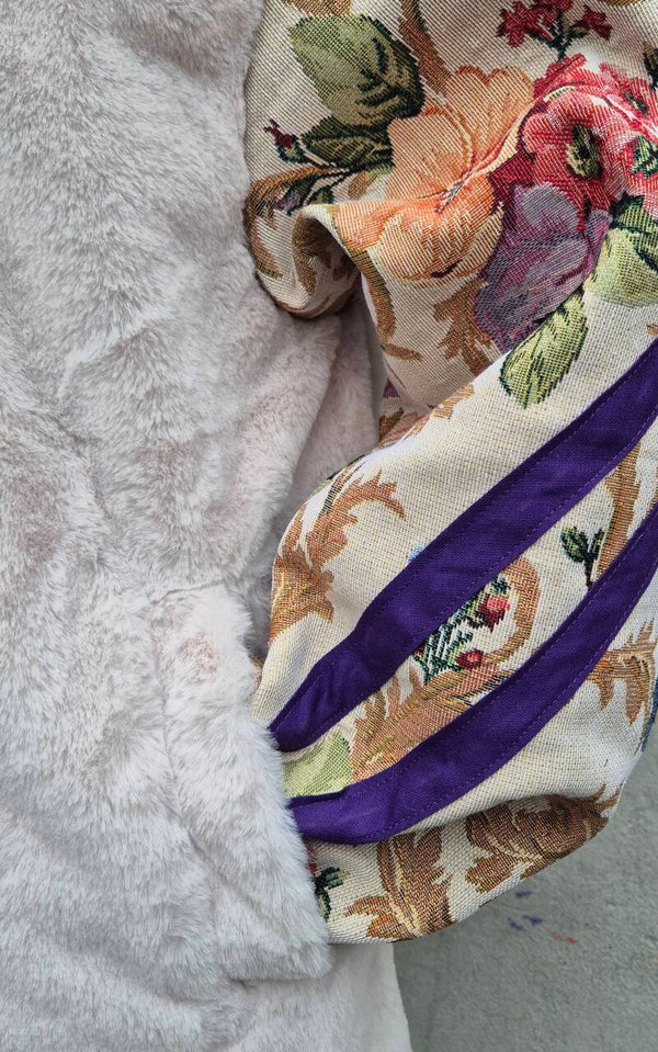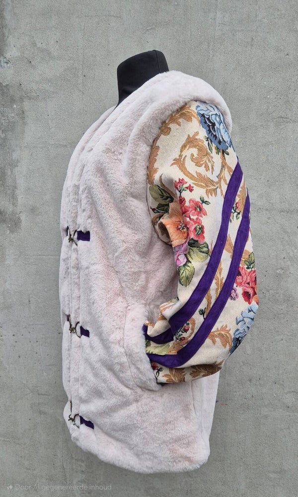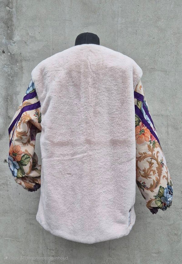 Deze one of a kind jas combineert een fluffy teddy body met prachtige vintage bloemige mouwen. De paarse details en bijzondere sluitingen maken ’m helemaal speciaal.